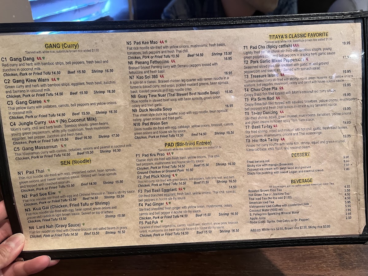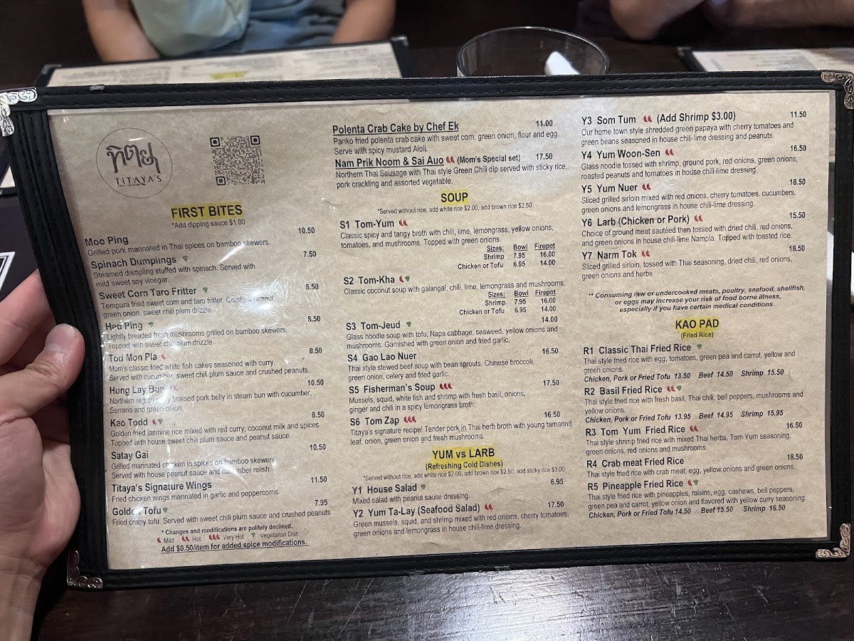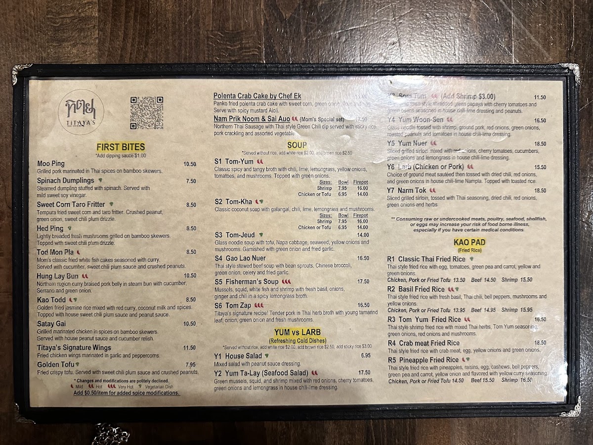 Service at Titaya’s is another highlight, with staff known for being friendly, knowledgeable, and efficient. The overall dining experience creates a joyful escape into the heart of Thai culinary tradition.