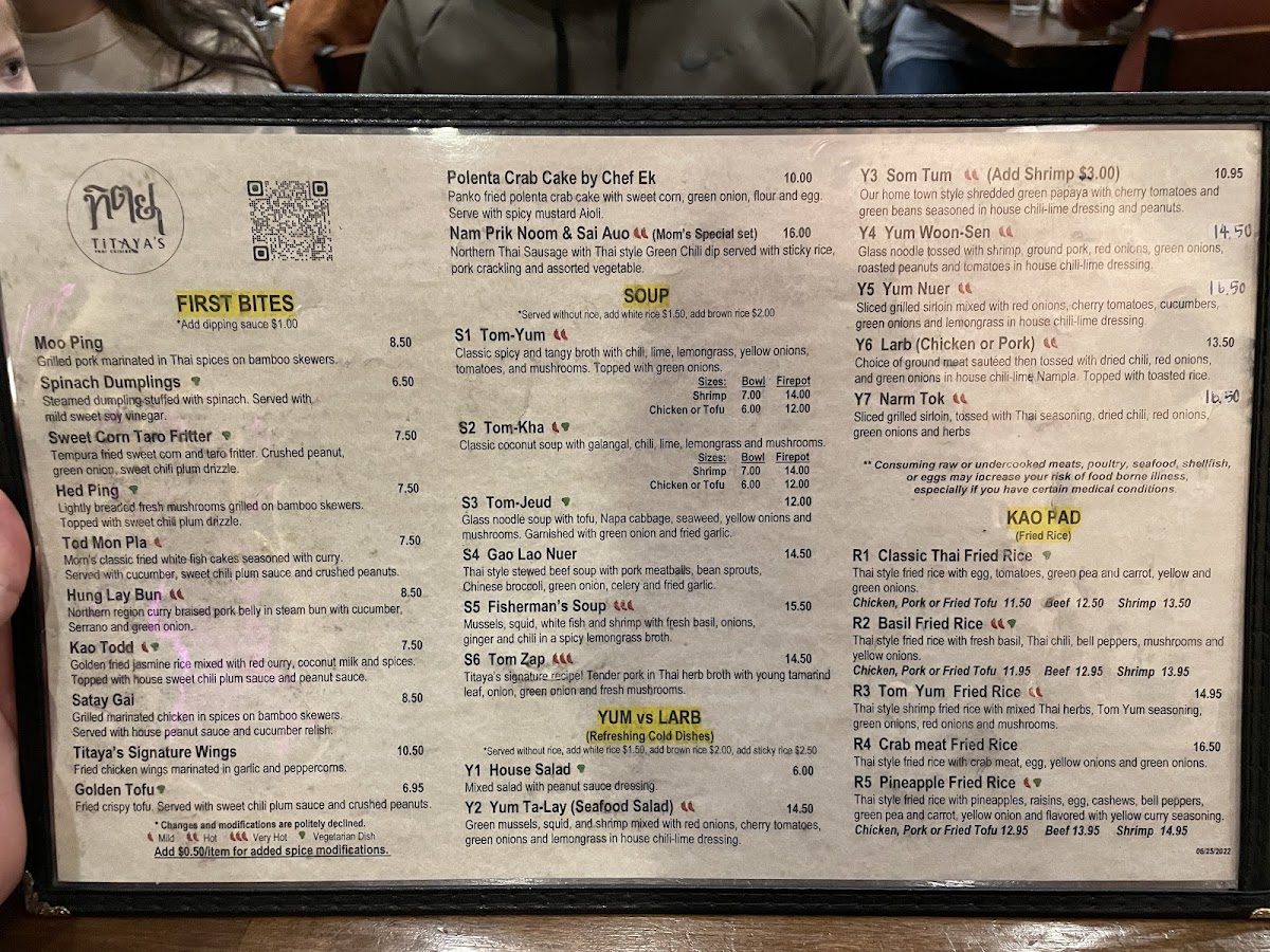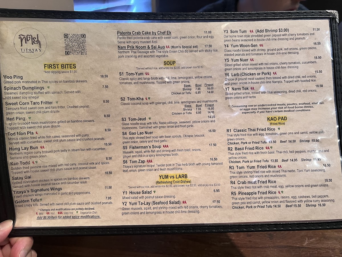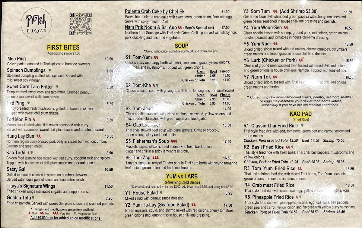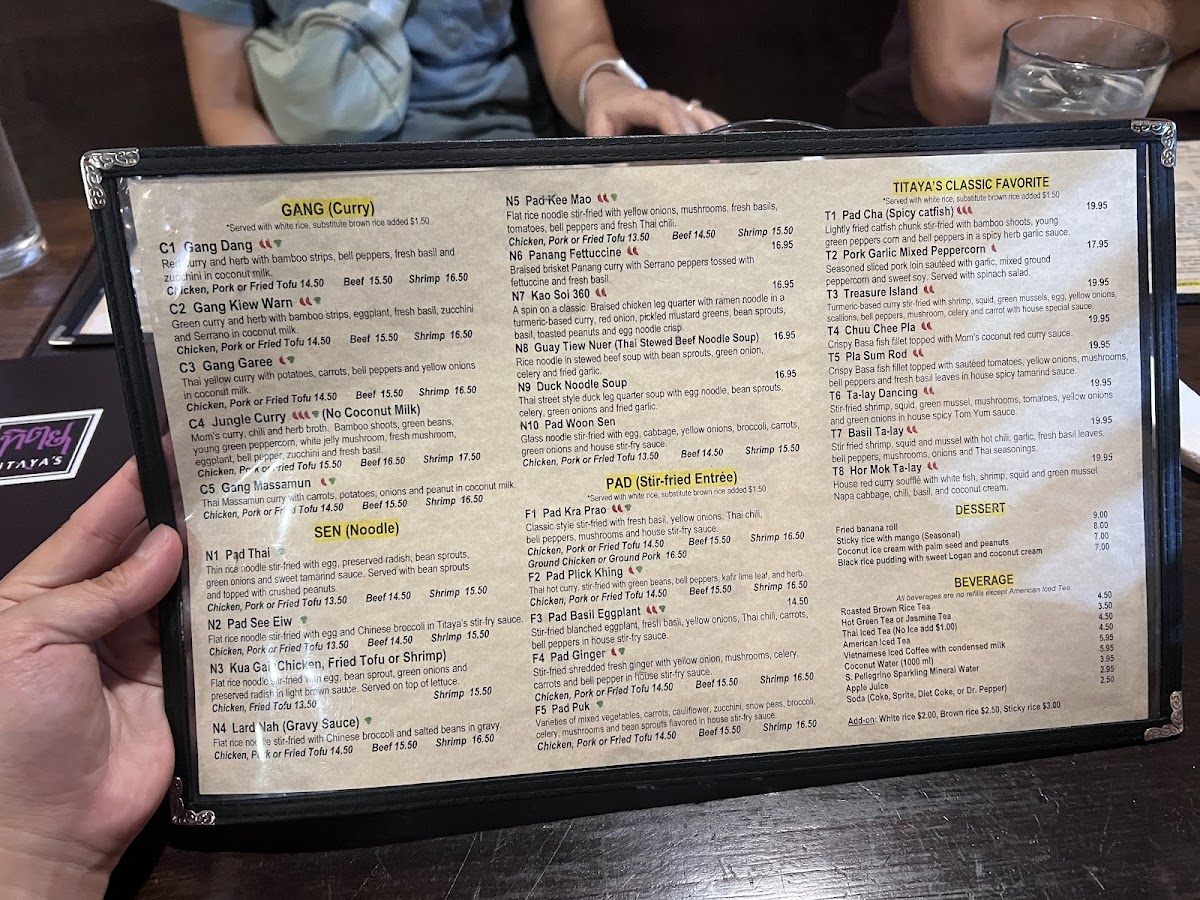 Service at Titaya’s is another highlight, with staff known for being friendly, knowledgeable, and efficient. The overall dining experience creates a joyful escape into the heart of Thai culinary tradition.